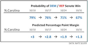 - North Carolina. The NC Senate race, according to Silver, continues to tighten. As opposed to the 3-percentage-point margin he predicted 4 weeks ago, he has now shrunk Kay Hagan’s (D) margin over Thom Tillis (R) to 1.3 percentage points. He sees a 67% chance of a Hagan (D) win, which is down considerably from his 79% probability 4 weeks ago. The New York Times, Real Clear Politics, and Rasmussen are all leaning toward Hagan (D), and all currently see the gap at a whisker-thin 1 percentage point.