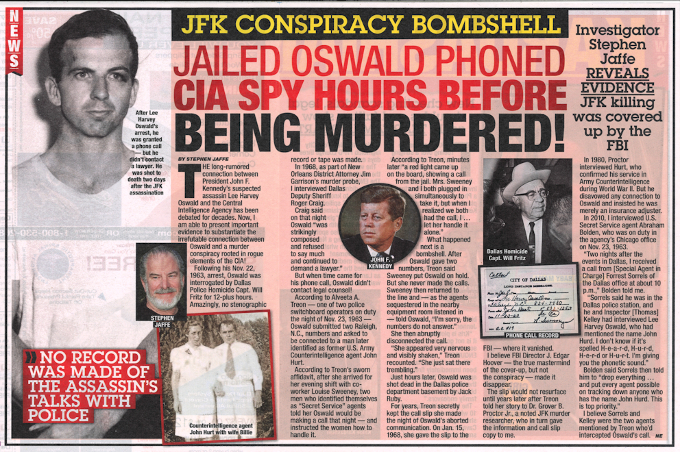 While Jaffe maintains complete textual control over his articles, he has zero say about the headlines and cover copy. As a result of that and the time deadline and space restrictions imposed by the Enquirer, a couple of errors slipped in unawares. The main error is found in both of the two headlines (on the cover and over the article). “JFK Murder Sensation: Oswald made jailhouse phone call to CIA agent!” If you read Jaffe’s article, you’ll see that the person whom Lee Oswald attempted to call was not CIA, but rather a former Special Agent for U.S. Army Counterintelligence. I think that’s explosive and provocative enough — but I suppose the magazine’s editorial staff thought “CIA” sounded sexier and perhaps more sinister. Even with this, and one or two other small glitches, Jaffe has written a very good piece, and he proved once again what a dedicated truth-seeker and accomplished writer he is.