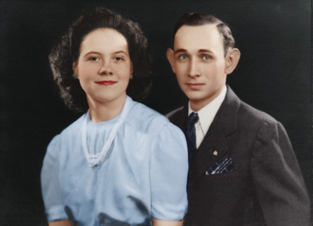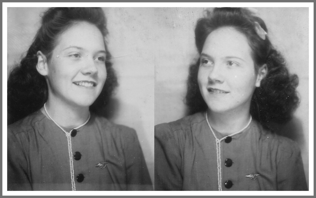 (Taken 7 years apart — Daddy in 1944 and Mother in 1951 — the photos nevertheless show both of them at age 26. In addition, she was pregnant with me when she had this one made!)